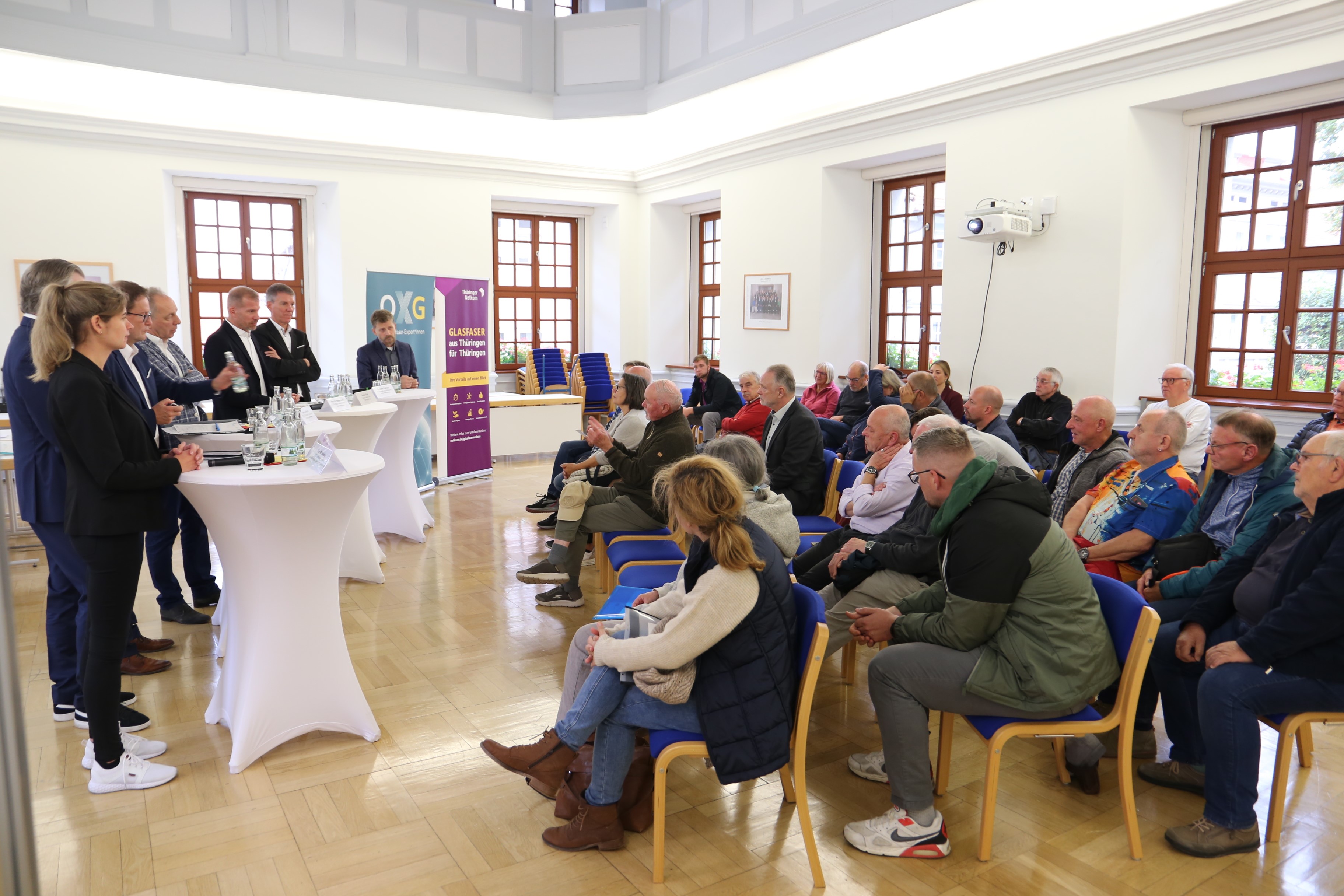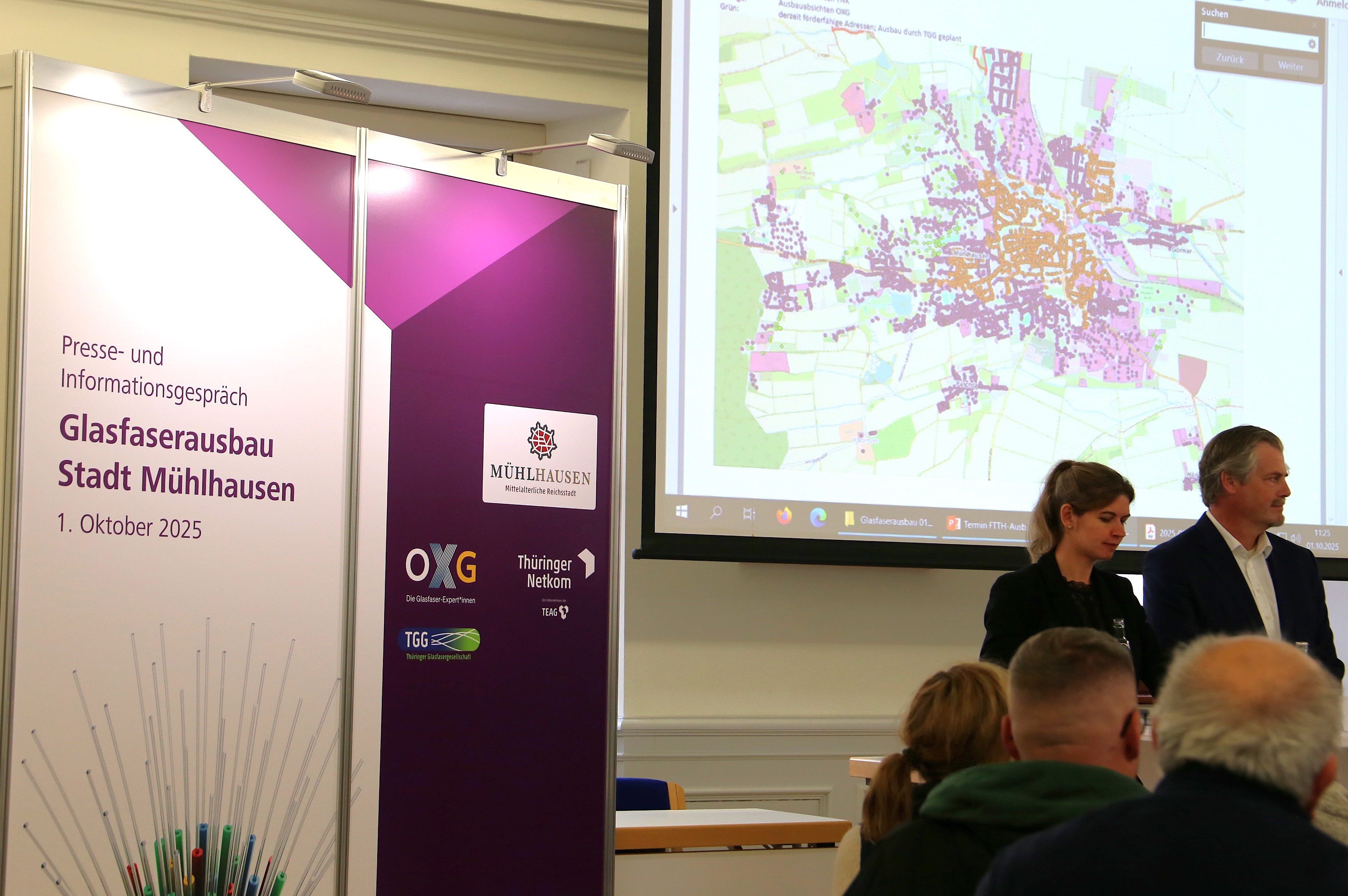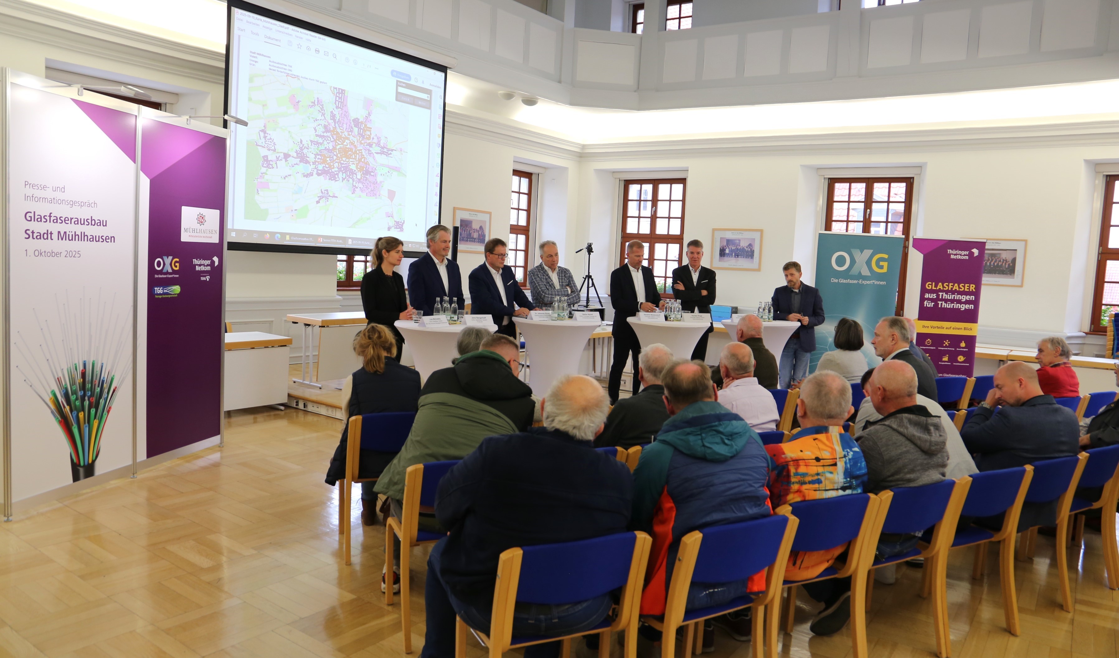 Mühlhausen. Auf einer offiziellen Info-Veranstaltung sind am Vormittag im Rathaus Mühlhausen die neuen Ausbaupläne für die Glasfasererschließung der Kreisstadt vorgestellt worden. Die neuerliche Präsentation des Glasfaserprojektes war notwendig geworden, nach dem kurzfristig das ursprünglich mit dem Glasfaserausbau im Stadtgebiet beauftragte Unternehmen vom Vertrag zurückgetreten war. Auf Initiative der Stadtverwaltung Mühlhausen übernehmen jetzt die Thüringer Netkom und der Glasfaseranbieter OXG gemeinschaftlich den Aufbau eines nahezu flächendeckenden Glasfasernetzes.